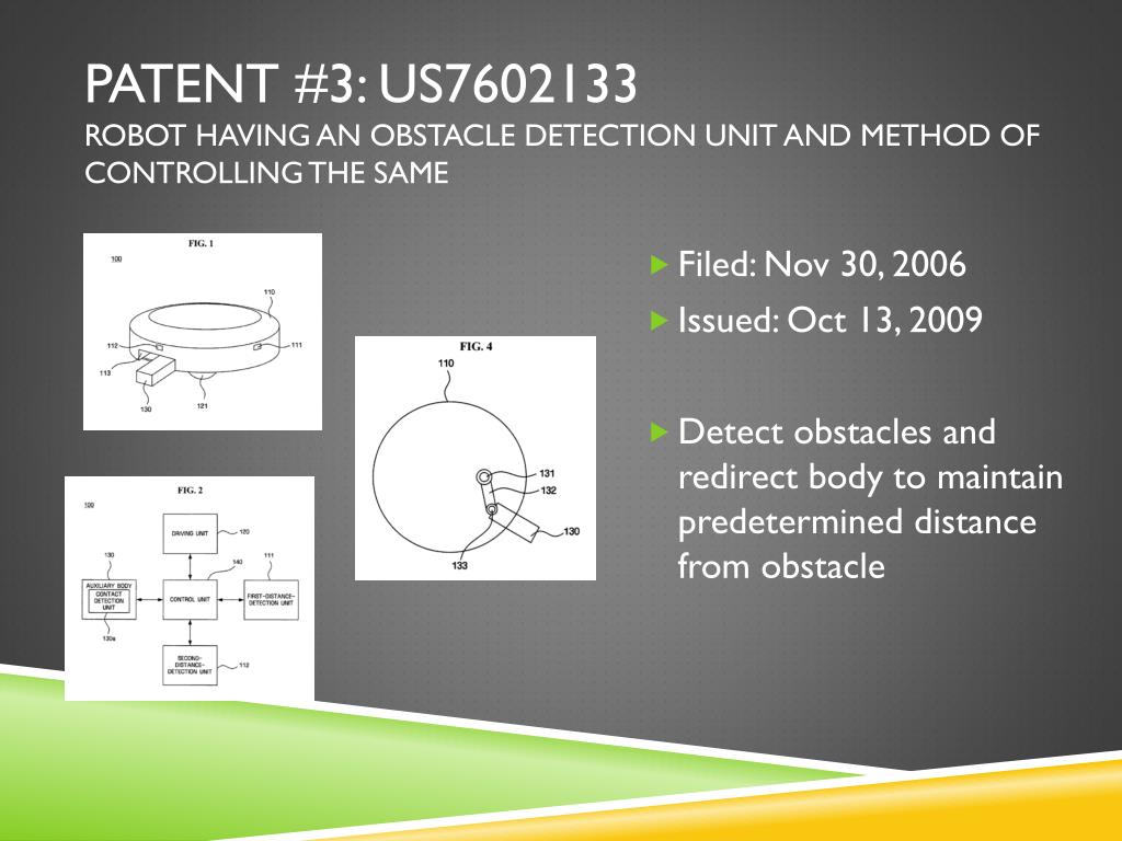PATENT #3: US7602133Robot having an obstacle detection unit and method of controlling the same • Filed: Nov 30, 2006 • Issued: Oct 13, 2009 • Detect obstacles and redirect body to maintain predetermined distance from obstacle