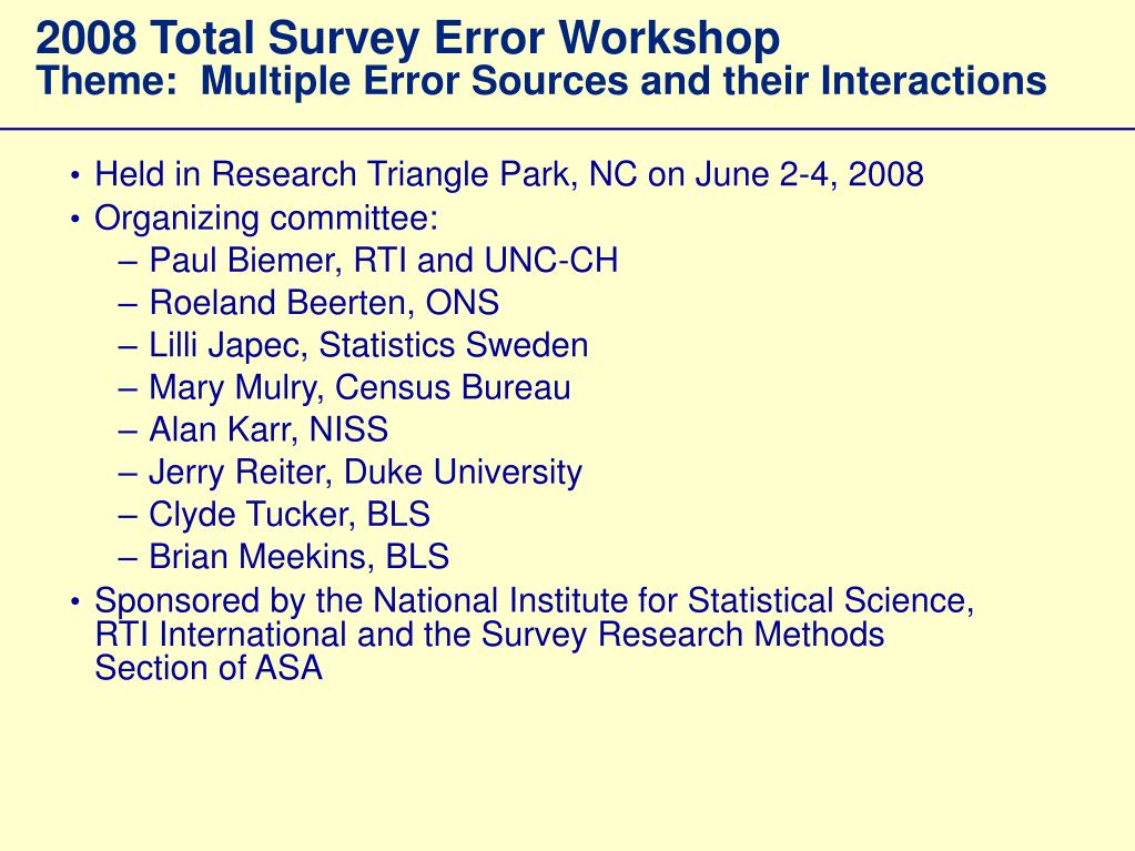 2008 Total Survey Error WorkshopTheme: Multiple Error Sources and their Interactions • Held in Research Triangle Park, NC on June 2-4, 2008 • Organizing committee: • Paul Biemer, RTI and UNC-CH • Roeland Beerten, ONS • Lilli Japec, Statistics Sweden • Mary Mulry, Census Bureau • Alan Karr, NISS • Jerry Reiter, Duke University • Clyde Tucker, BLS • Brian Meekins, BLS • Sponsored by the National Institute for Statistical Science, RTI International and the Survey Research Methods Section of ASA