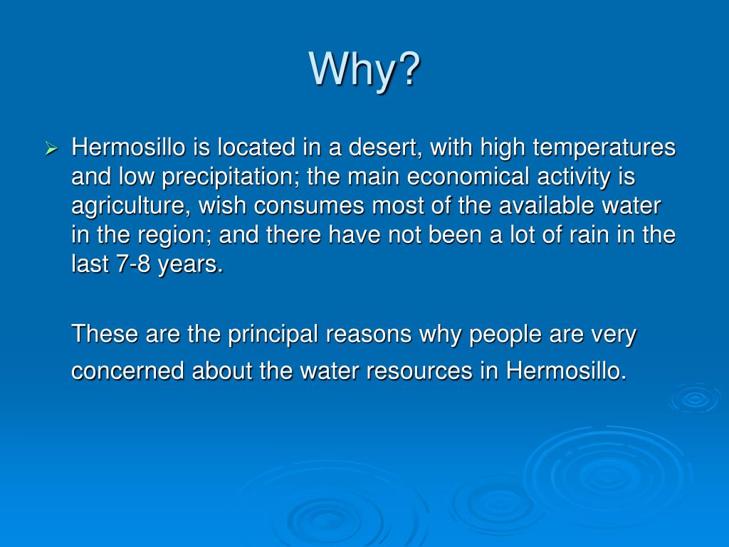 Why? • Hermosillo is located in a desert, with high temperatures and low precipitation; the main economical activity is agriculture, wish consumes most of the available water in the region; and there have not been a lot of rain in the last 7-8 years. These are the principal reasons why people are very concerned about the water resources in Hermosillo.