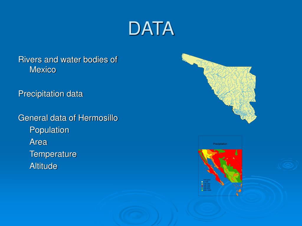 DATA Rivers and water bodies of Mexico Precipitation data General data of Hermosillo Population Area Temperature Altitude