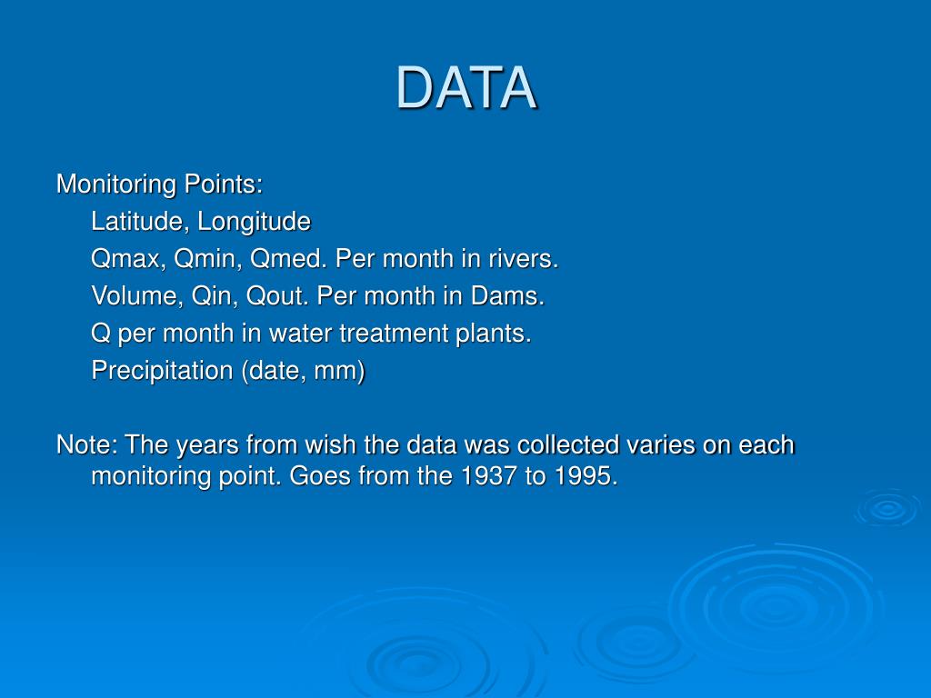 DATA Monitoring Points: Latitude, Longitude Qmax, Qmin, Qmed. Per month in rivers. Volume, Qin, Qout. Per month in Dams. Q per month in water treatment plants. Precipitation (date, mm) Note: The years from wish the data was collected varies on each monitoring point. Goes from the 1937 to 1995.