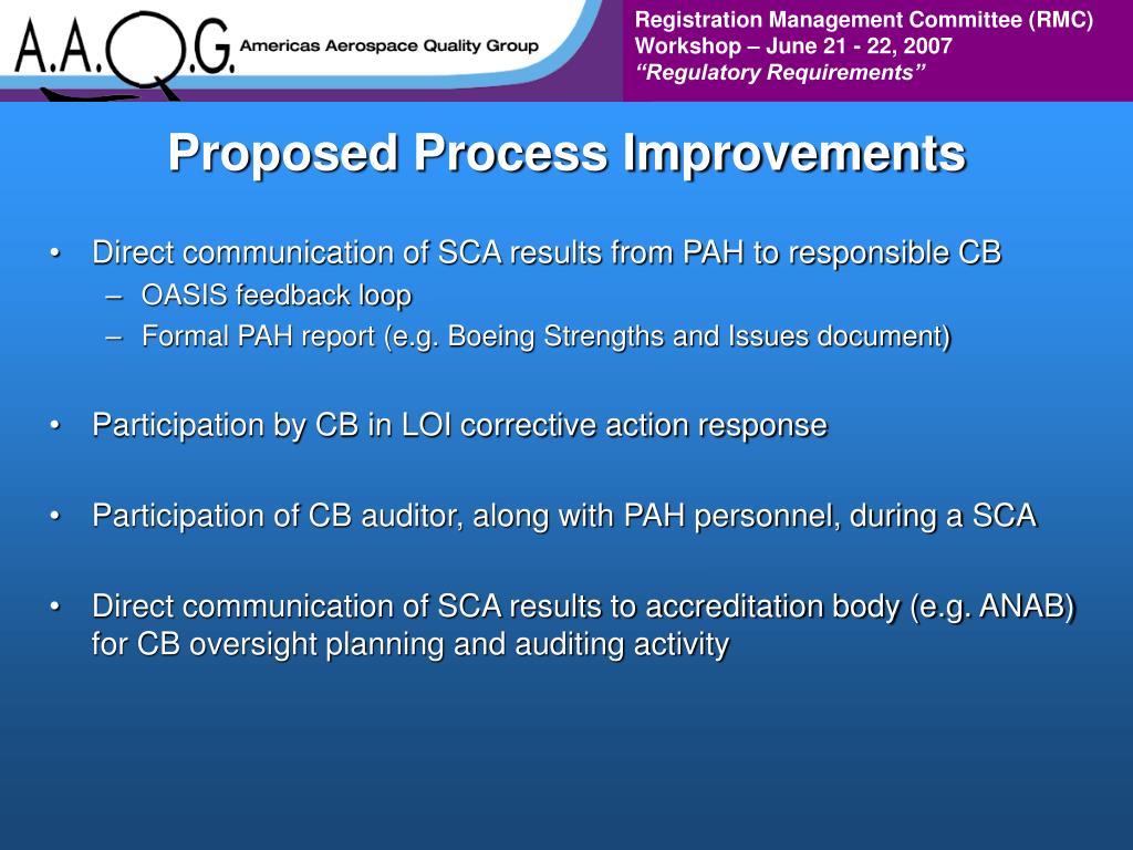 Proposed Process Improvements • Direct communication of SCA results from PAH to responsible CB • OASIS feedback loop • Formal PAH report (e.g. Boeing Strengths and Issues document) • Participation by CB in LOI corrective action response • Participation of CB auditor, along with PAH personnel, during a SCA • Direct communication of SCA results to accreditation body (e.g. ANAB) for CB oversight planning and auditing activity