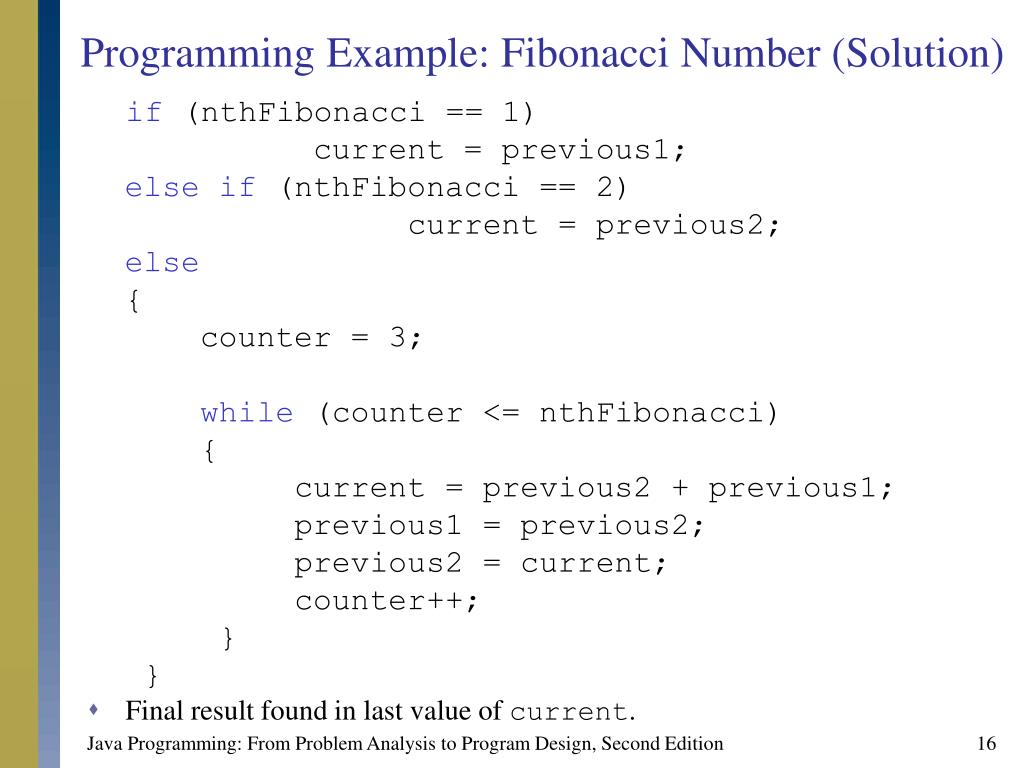 Programming Example: Fibonacci Number (Solution) if (nthFibonacci == 1) current = previous1; else if (nthFibonacci == 2) current = previous2; else { counter = 3; while (counter <= nthFibonacci) { current = previous2 + previous1; previous1 = previous2; previous2 = current; counter++; } } • Final result found in last value of current. Java Programming: From Problem Analysis to Program Design, Second Edition