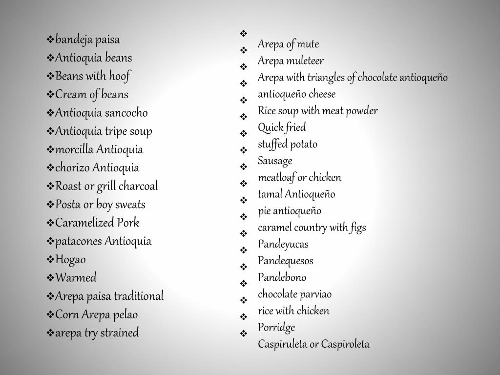 Arepa of mute • Arepa muleteer • Arepa with triangles of chocolate antioqueño • antioqueño cheese • Rice soup with meat powder • Quick fried • stuffed potato • Sausage • meatloaf or chicken • tamal Antioqueño • pie antioqueño • caramel country with figs • Pandeyucas • Pandequesos • Pandebono • chocolate parviao • rice with chicken • Porridge • Caspiruleta or Caspiroleta • bandeja paisa • Antioquia beans • Beans with hoof • Cream of beans • Antioquia sancocho • Antioquia tripe soup • morcilla Antioquia • chorizo Antioquia • Roast or grill charcoal • Posta or boy sweats • Caramelized Pork • patacones Antioquia • Hogao • Warmed • Arepa paisa traditional • Corn Arepa pelao • arepa try strained