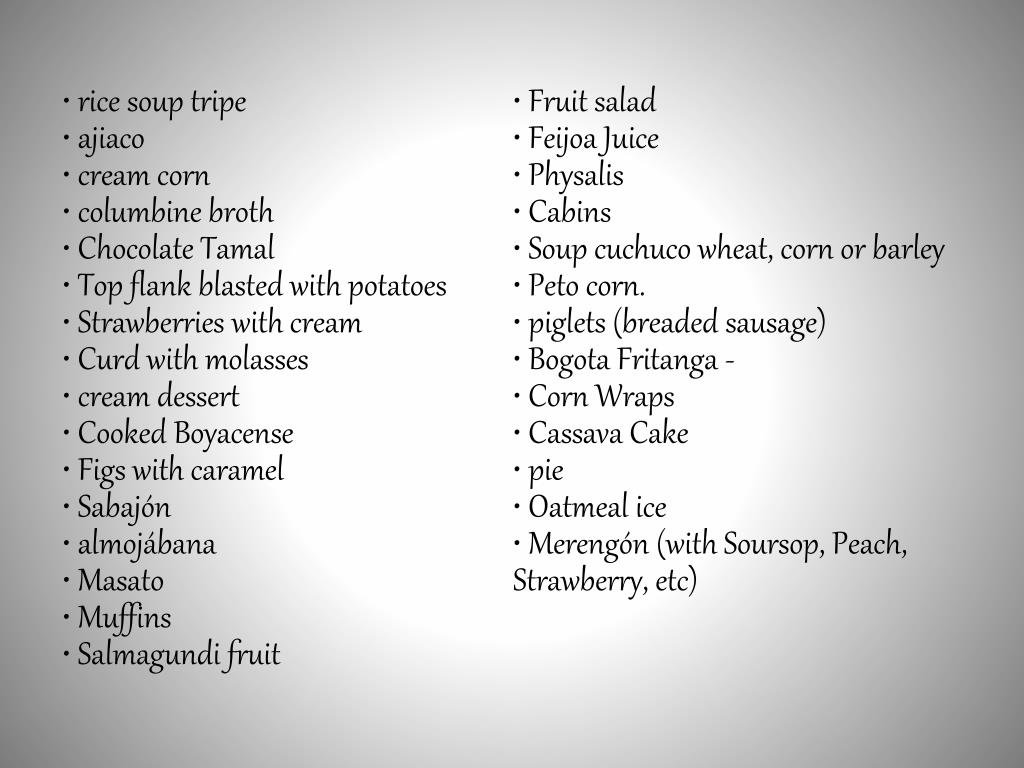 • rice soup tripe • ajiaco• cream corn• columbine broth• Chocolate Tamal• Top flank blasted with potatoes• Strawberries with cream• Curd with molasses• cream dessert• Cooked Boyacense• Figs with caramel• Sabajón• almojábana• Masato• Muffins• Salmagundi fruit• Fruit salad• Feijoa Juice• Physalis• Cabins• Soup cuchuco wheat, corn or barley• Peto corn.• piglets (breaded sausage)• Bogota Fritanga -• Corn Wraps• Cassava Cake• pie• Oatmeal ice• Merengón (with Soursop, Peach, Strawberry, etc)