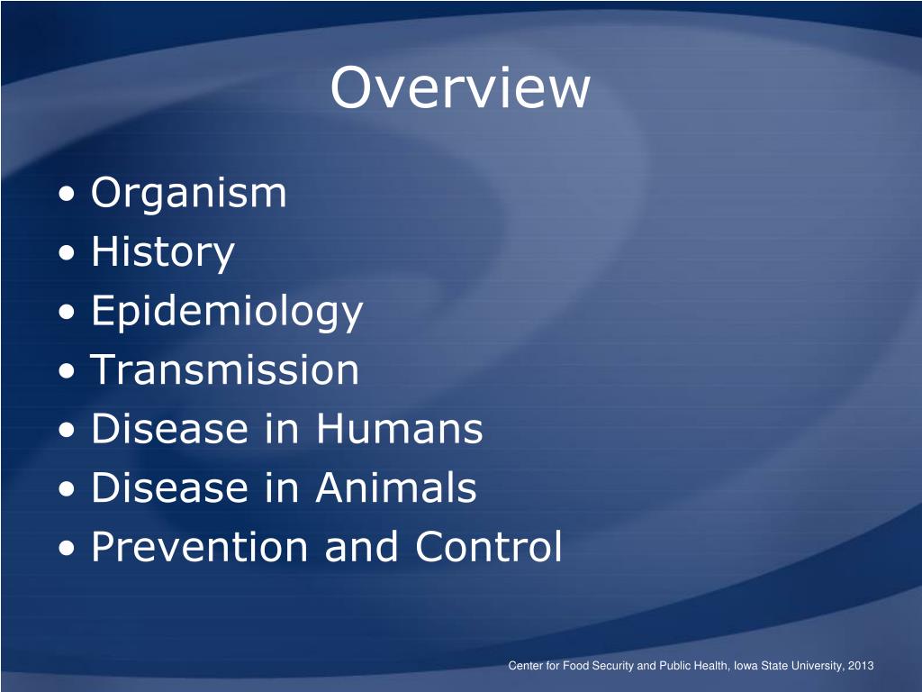 Overview Organism History Epidemiology Transmission Disease in Humans Disease in Animals Prevention and Control Center for Food Security and Public Health, Iowa State University, 2013