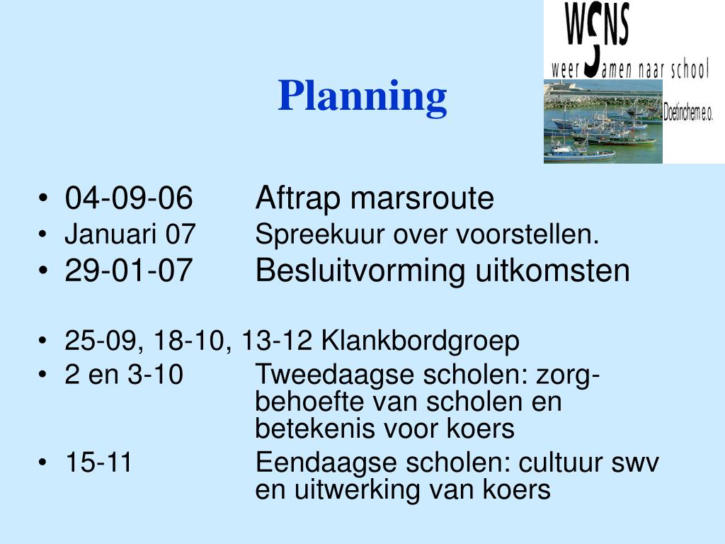 Planning • 04-09-06 Aftrap marsroute • Januari 07 Spreekuur over voorstellen. • 29-01-07 Besluitvorming uitkomsten • 25-09, 18-10, 13-12 Klankbordgroep • 2 en 3-10 Tweedaagse scholen: zorg- behoefte van scholen en betekenis voor koers • 15-11 Eendaagse scholen: cultuur swv en uitwerking van koers