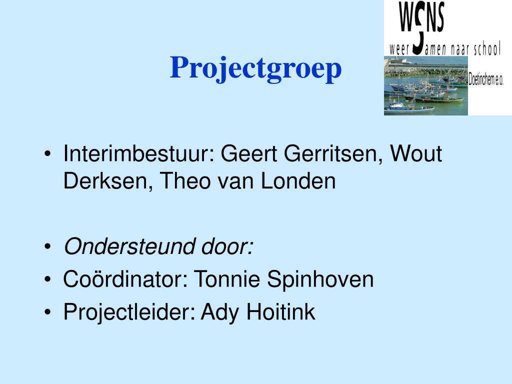 Projectgroep • Interimbestuur: Geert Gerritsen, Wout Derksen, Theo van Londen • Ondersteund door: • Coördinator: Tonnie Spinhoven • Projectleider: Ady Hoitink