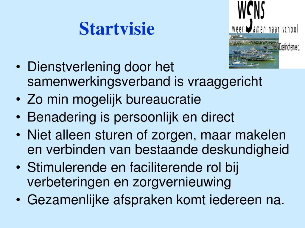 Startvisie • Dienstverlening door het samenwerkingsverband is vraaggericht • Zo min mogelijk bureaucratie • Benadering is persoonlijk en direct • Niet alleen sturen of zorgen, maar makelen en verbinden van bestaande deskundigheid • Stimulerende en faciliterende rol bij verbeteringen en zorgvernieuwing • Gezamenlijke afspraken komt iedereen na.