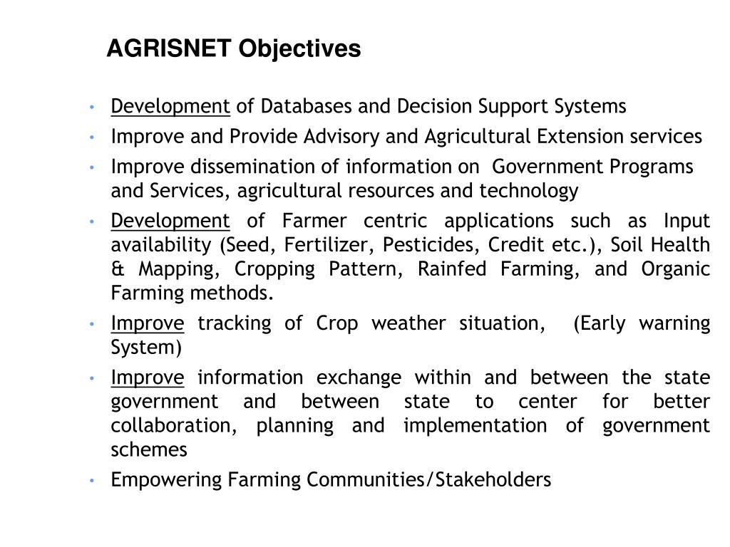 AGRISNET Objectives • Development of Databases and Decision Support Systems • Improve and Provide Advisory and Agricultural Extension services • Improve dissemination of information on Government Programs and Services, agricultural resources and technology • Development of Farmer centric applications such as Input availability (Seed, Fertilizer, Pesticides, Credit etc.), Soil Health & Mapping, Cropping Pattern, Rainfed Farming, and Organic Farming methods. • Improve tracking of Crop weather situation, (Early warning System) • Improve information exchange within and between the state government and between state to center for better collaboration, planning and implementation of government schemes • Empowering Farming Communities/Stakeholders