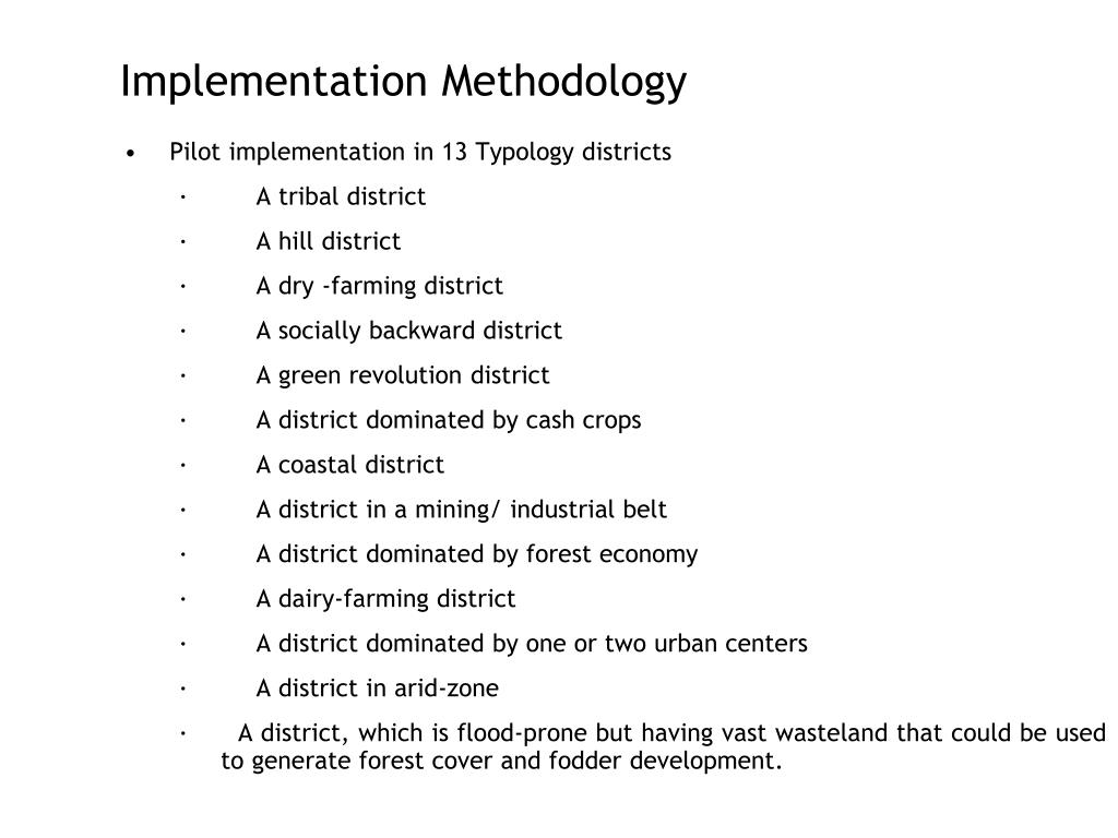 Implementation Methodology • Pilot implementation in 13 Typology districts ·A tribal district ·A hill district ·A dry -farming district ·A socially backward district ·A green revolution district ·A district dominated by cash crops ·A coastal district ·A district in a mining/ industrial belt ·A district dominated by forest economy ·A dairy-farming district ·A district dominated by one or two urban centers ·A district in arid-zone ·A district, which is flood-prone but having vast wasteland that could be used to generate forest cover and fodder development.