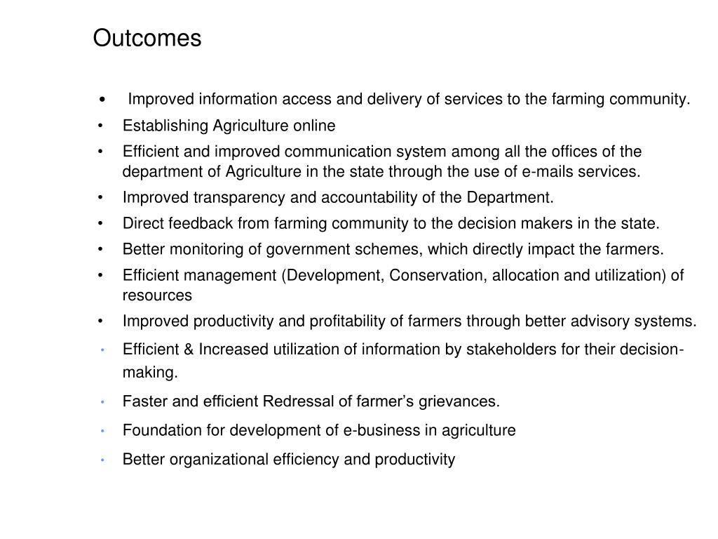 Outcomes • Improved information access and delivery of services to the farming community. • Establishing Agriculture online • Efficient and improved communication system among all the offices of the department of Agriculture in the state through the use of e-mails services. • Improved transparency and accountability of the Department. • Direct feedback from farming community to the decision makers in the state. • Better monitoring of government schemes, which directly impact the farmers. • Efficient management (Development, Conservation, allocation and utilization) of resources • Improved productivity and profitability of farmers through better advisory systems. • Efficient & Increased utilization of information by stakeholders for their decision-making. • Faster and efficient Redressal of farmer’s grievances. • Foundation for development of e-business in agriculture • Better organizational efficiency and productivity