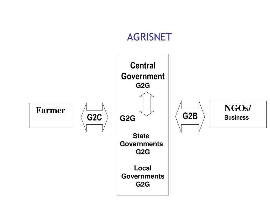 Central Government G2G G2G State Governments G2G Local Governments G2G G2B NGOs/ Business Farmer G2C