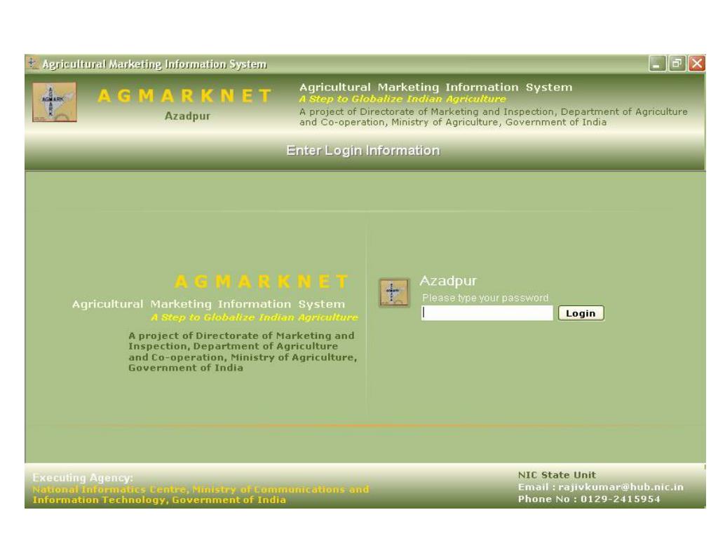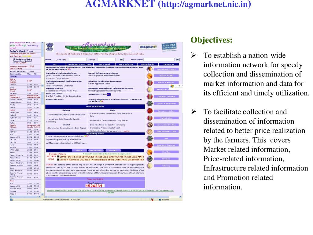 AGMARKNET (http://agmarknet.nic.in) • Objectives: • To establish a nation-wide information network for speedy collection and dissemination of market information and data for its efficient and timely utilization. • To facilitate collection and dissemination of information related to better price realization by the farmers. This covers Market related information, Price-related information, Infrastructure related information and Promotion related information.