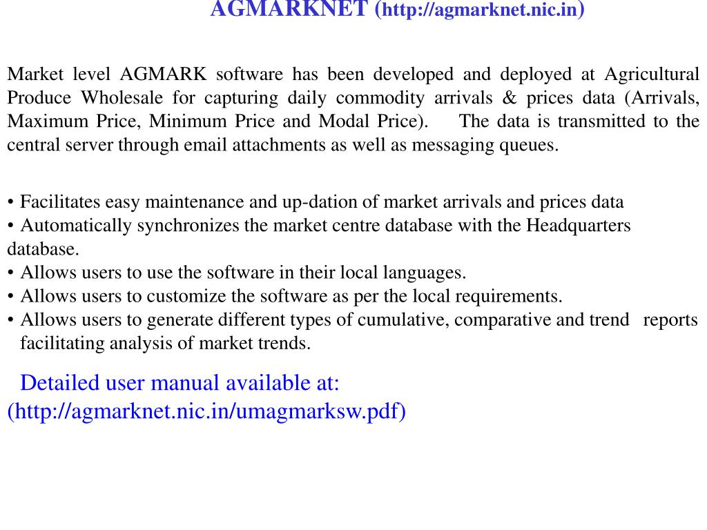 AGMARKNET (http://agmarknet.nic.in) Market level AGMARK software has been developed and deployed at Agricultural Produce Wholesale for capturing daily commodity arrivals & prices data (Arrivals, Maximum Price, Minimum Price and Modal Price). The data is transmitted to the central server through email attachments as well as messaging queues. • AGMARK software features • Facilitates easy maintenance and up-dation of market arrivals and prices data • Automatically synchronizes the market centre database with the Headquarters database. • Allows users to use the software in their local languages. • Allows users to customize the software as per the local requirements. • Allows users to generate different types of cumulative, comparative and trend reports facilitating analysis of market trends. • Detailed user manual available at: (http://agmarknet.nic.in/umagmarksw.pdf)
