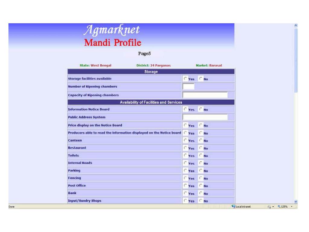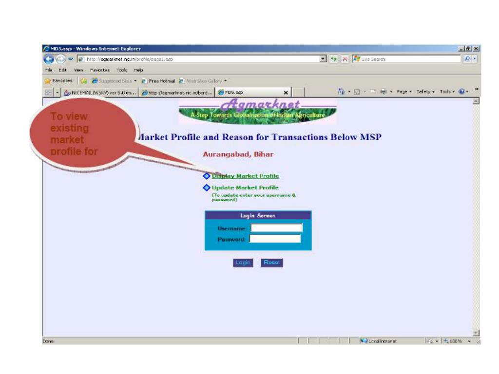 AGMARKNET (http://agmarknet.nic.in) Market Profiles: http://agmarknet.nic.in/profile/page1.asp To enter and update the market profile information of a market, access the web page by using the above . Markets can update the market profile information like General information, Administration, Rail/Road Connectivity, Market Area, Arrivals & Dispatches, Licensed Functionaries, Market functionaries, Traditional methods, Transportation, storage, Availability of facilities & services, Market charges and Financial position , etc.