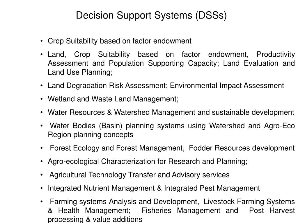 Decision Support Systems (DSSs) • Crop Suitability based on factor endowment • Land, Crop Suitability based on factor endowment, Productivity Assessment and Population Supporting Capacity; Land Evaluation and Land Use Planning; • Land Degradation Risk Assessment; Environmental Impact Assessment • Wetland and Waste Land Management; • Water Resources & Watershed Management and sustainable development • Water Bodies (Basin) planning systems using Watershed and Agro-Eco Region planning concepts • Forest Ecology and Forest Management, Fodder Resources development • Agro-ecological Characterization for Research and Planning; • Agricultural Technology Transfer and Advisory services • Integrated Nutrient Management & Integrated Pest Management • Farming systems Analysis and Development, Livestock Farming Systems & Health Management; Fisheries Management and Post Harvest processing & value additions