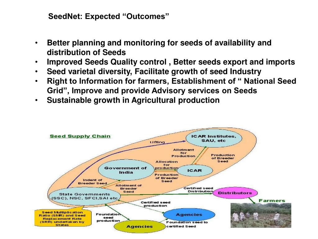 SeedNet: Expected “Outcomes” • Better planning and monitoring for seeds of availability and distribution of Seeds • Improved Seeds Quality control , Better seeds export and imports • Seed varietal diversity, Facilitate growth of seed Industry • Right to Information for farmers, Establishment of “ National Seed Grid”, Improve and provide Advisory services on Seeds • Sustainable growth in Agricultural production