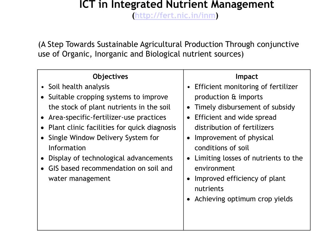 ICT in Integrated Nutrient Management (http://fert.nic.in/inm) (A Step Towards Sustainable Agricultural Production Through conjunctive use of Organic, Inorganic and Biological nutrient sources)
