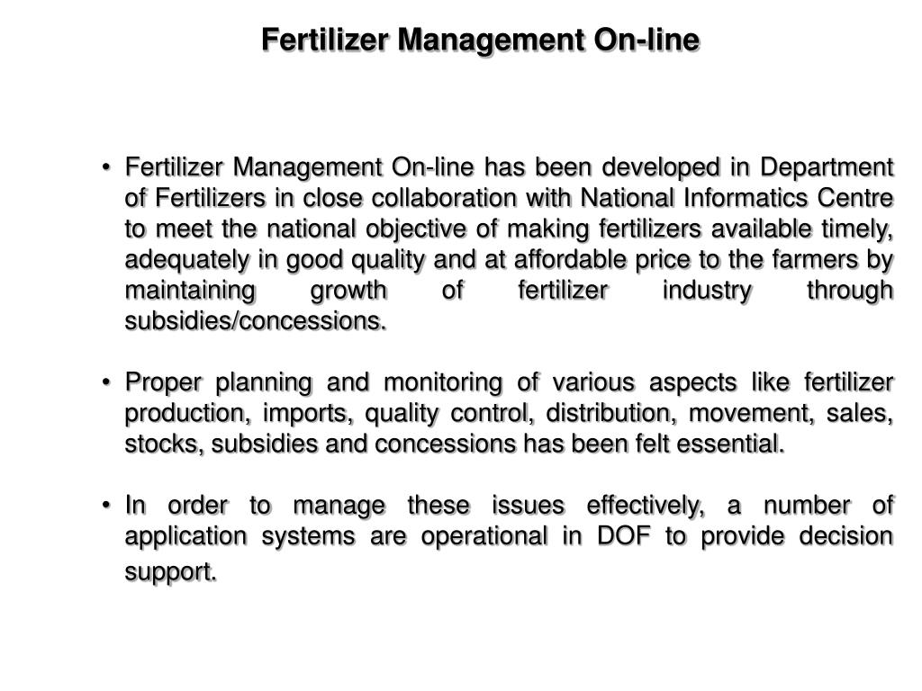 Fertilizer Management On-line • Fertilizer Management On-line has been developed in Department of Fertilizers in close collaboration with National Informatics Centre to meet the national objective of making fertilizers available timely, adequately in good quality and at affordable price to the farmers by maintaining growth of fertilizer industry through subsidies/concessions. • Proper planning and monitoring of various aspects like fertilizer production, imports, quality control, distribution, movement, sales, stocks, subsidies and concessions has been felt essential. • In order to manage these issues effectively, a number of application systems are operational in DOF to provide decision support.
