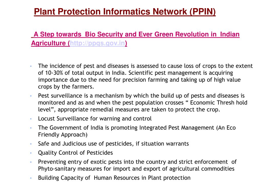 Plant Protection Informatics Network (PPIN)A Step towards Bio Security and Ever Green Revolution in Indian Agriculture (http://ppqs.gov.in) • The incidence of pest and diseases is assessed to cause loss of crops to the extent of 10-30% of total output in India. Scientific pest management is acquiring importance due to the need for precision farming and taking up of high value crops by the farmers. • Pest surveillance is a mechanism by which the build up of pests and diseases is monitored and as and when the pest population crosses “ Economic Thresh hold level”, appropriate remedial measures are taken to protect the crop. • LocustSurveillance for warning and control • The Government of India is promoting Integrated Pest Management (An Eco Friendly Approach) • Safe and Judicious use of pesticides, if situation warrants • Quality Control of Pesticides • Preventing entry of exotic pests into the country and strict enforcement of Phyto-sanitary measures for import and export of agricultural commodities • Building Capacity of Human Resources in Plant protection