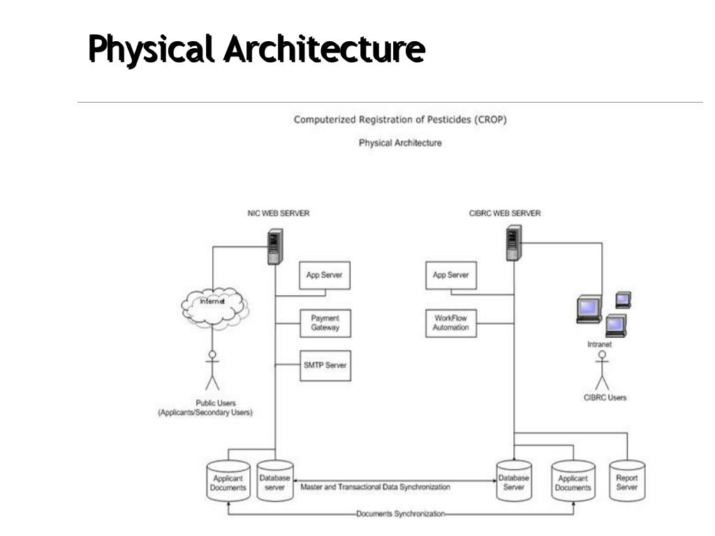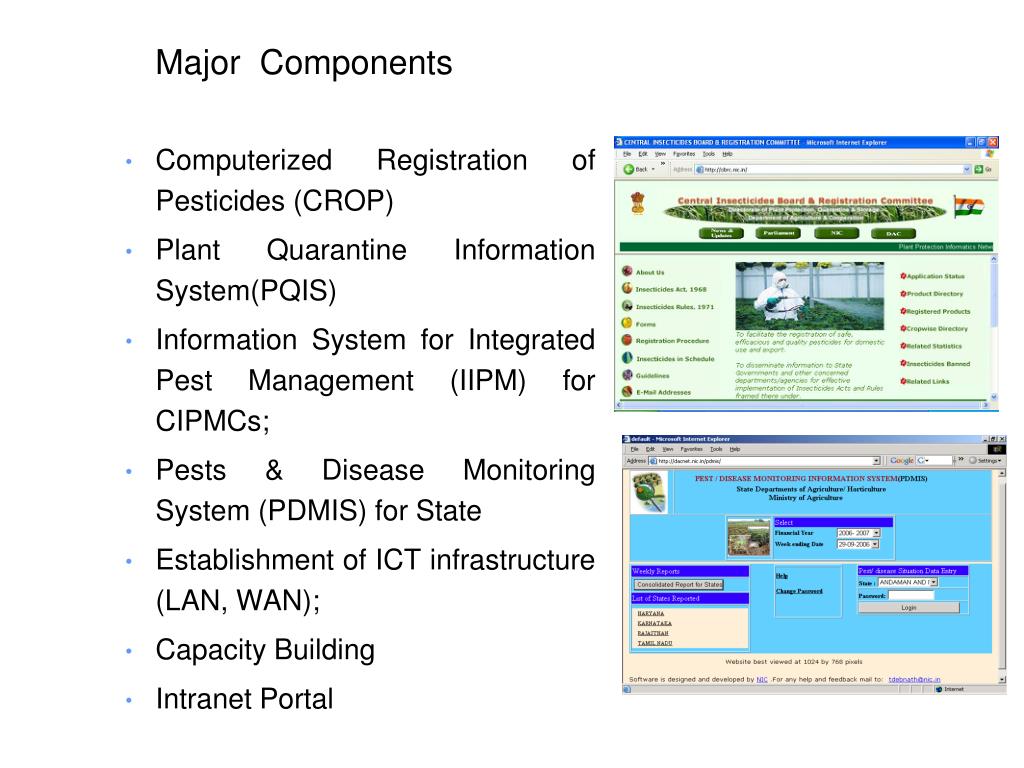 Major Components • Computerized Registration of Pesticides (CROP) • Plant Quarantine Information System(PQIS) • Information System for Integrated Pest Management (IIPM) for CIPMCs; • Pests & Disease Monitoring System (PDMIS) for State • Establishment of ICT infrastructure (LAN, WAN); • Capacity Building • Intranet Portal