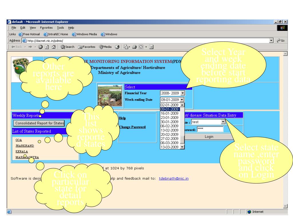Pests & Disease Monitoring System (PDMIS) Select Year and week ending date before start reporting data Other reports are available here This list shows reported states Select state name ,enter password and click on Login Click on particular state for detail reports