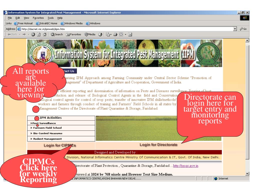 Information System for Integrated Pest Management (IIPM) All reports are available here for viewing Directorate can login here for target entry and monitoring reports CIPMCs Click here for weekly Reporting