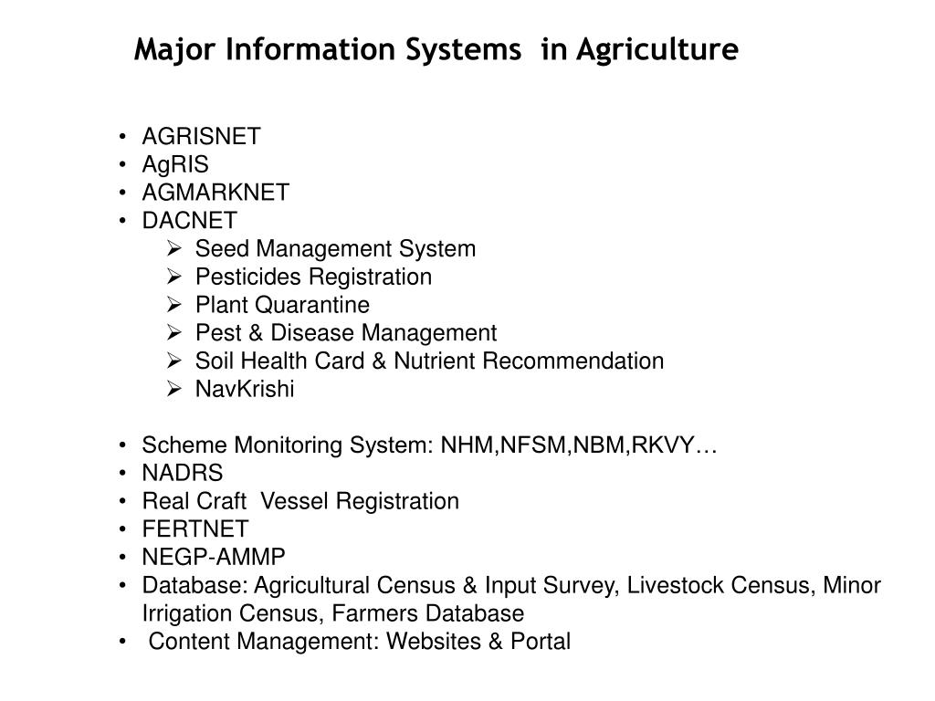 Major Information Systems in Agriculture • AGRISNET • AgRIS • AGMARKNET • DACNET • Seed Management System • Pesticides Registration • Plant Quarantine • Pest & Disease Management • Soil Health Card & Nutrient Recommendation • NavKrishi • Scheme Monitoring System: NHM,NFSM,NBM,RKVY… • NADRS • Real Craft Vessel Registration • FERTNET • NEGP-AMMP • Database: Agricultural Census & Input Survey, Livestock Census, Minor Irrigation Census, Farmers Database • Content Management: Websites & Portal