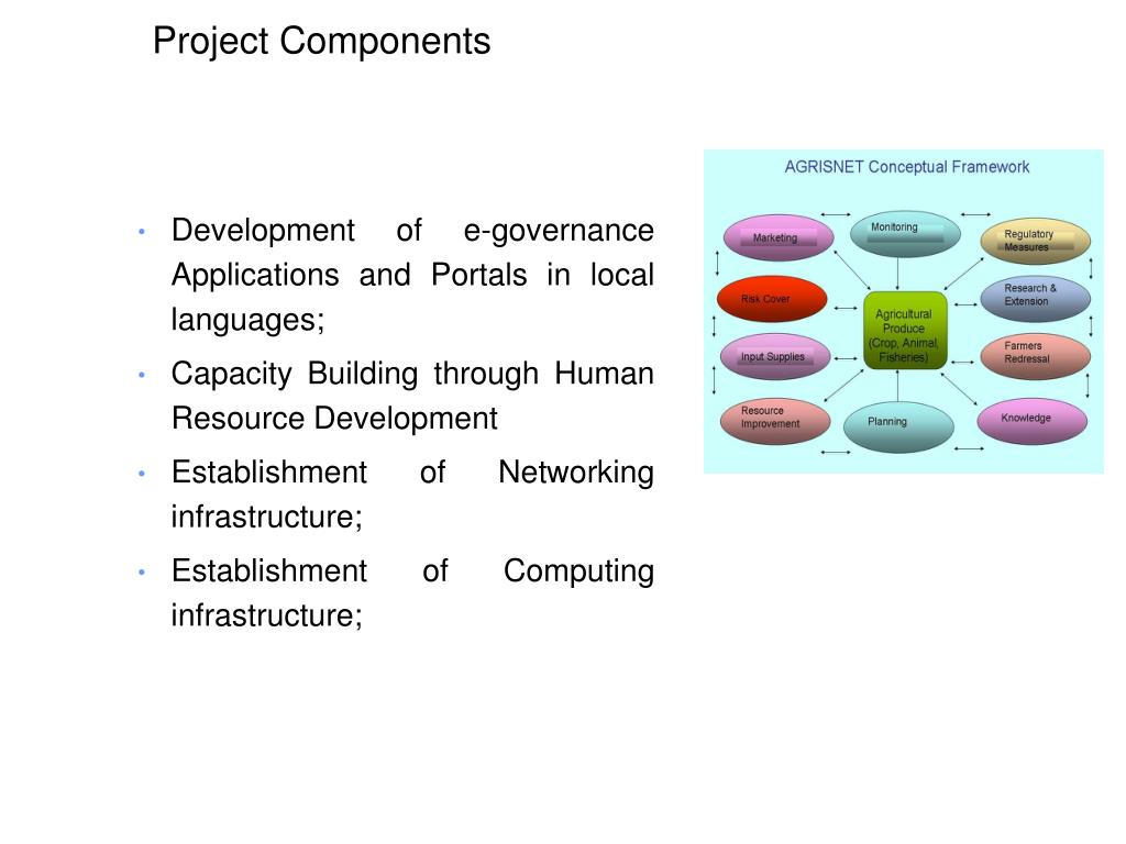 Project Components • Development of e-governance Applications and Portals in local languages; • Capacity Building through Human Resource Development • Establishment of Networking infrastructure; • Establishment of Computing infrastructure;