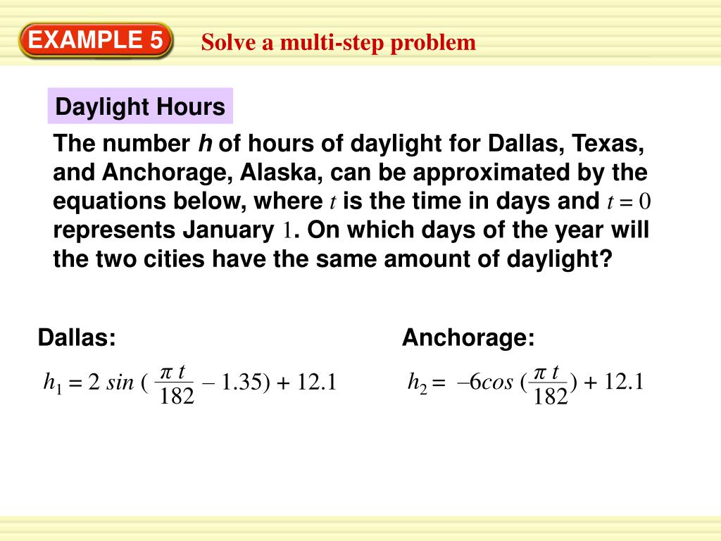 π t π t 182 182 = –6cos ( ) + 12.1 = 2 sin ( – 1.35) + 12.1 EXAMPLE 5 Solve a multi-step problem Daylight Hours The number h of hours of daylight for Dallas, Texas, and Anchorage, Alaska, can be approximated by the equations below, where tis the time in days and t = 0 represents January 1. On which days of the year will the two cities have the same amount of daylight? Dallas: h1 Anchorage: h2
