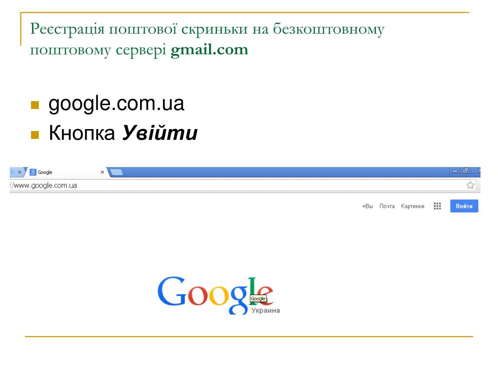 Реєстрація поштової скриньки на безкоштовному поштовому серверіgmail.com • google.com.ua • Кнопка Увійти
