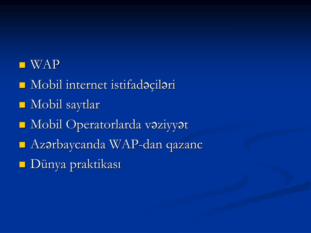 WAP Mobil internet istifadəçiləri Mobil saytlar Mobil Operatorlarda vəziyyət Azərbaycanda WAP-dan qazanc Dünya praktikası
