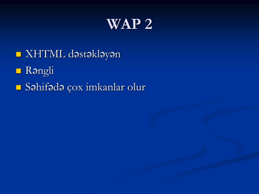Mobil İnternet və WAP • WAP nədir? • WAPforum İlk dəfə Ericsson, Nokia, Motorola və Phone.com birləşib WAPforum yaratdılar. • WAP sayt WAP saytmobiltelefondanbaxılabiləcəkmobil internet saytdır • WAP 1 və WAP 2 • WAPforum-un standartına görə WAP saytlar3qrupabölünür. WAP 1,WAP 2 və i-mode.
