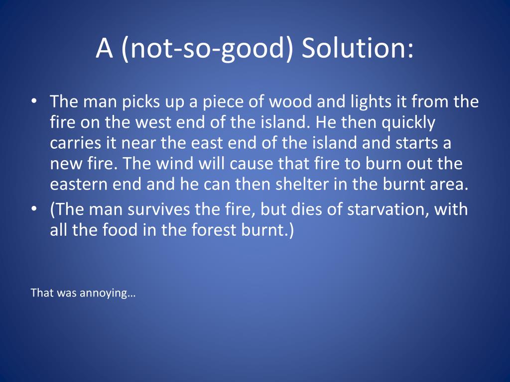 A (not-so-good) Solution: • The man picks up a piece of wood and lights it from the fire on the west end of the island. He then quickly carries it near the east end of the island and starts a new fire. The wind will cause that fire to burn out the eastern end and he can then shelter in the burnt area. • (The man survives the fire, but dies of starvation, with all the food in the forest burnt.) That was annoying…
