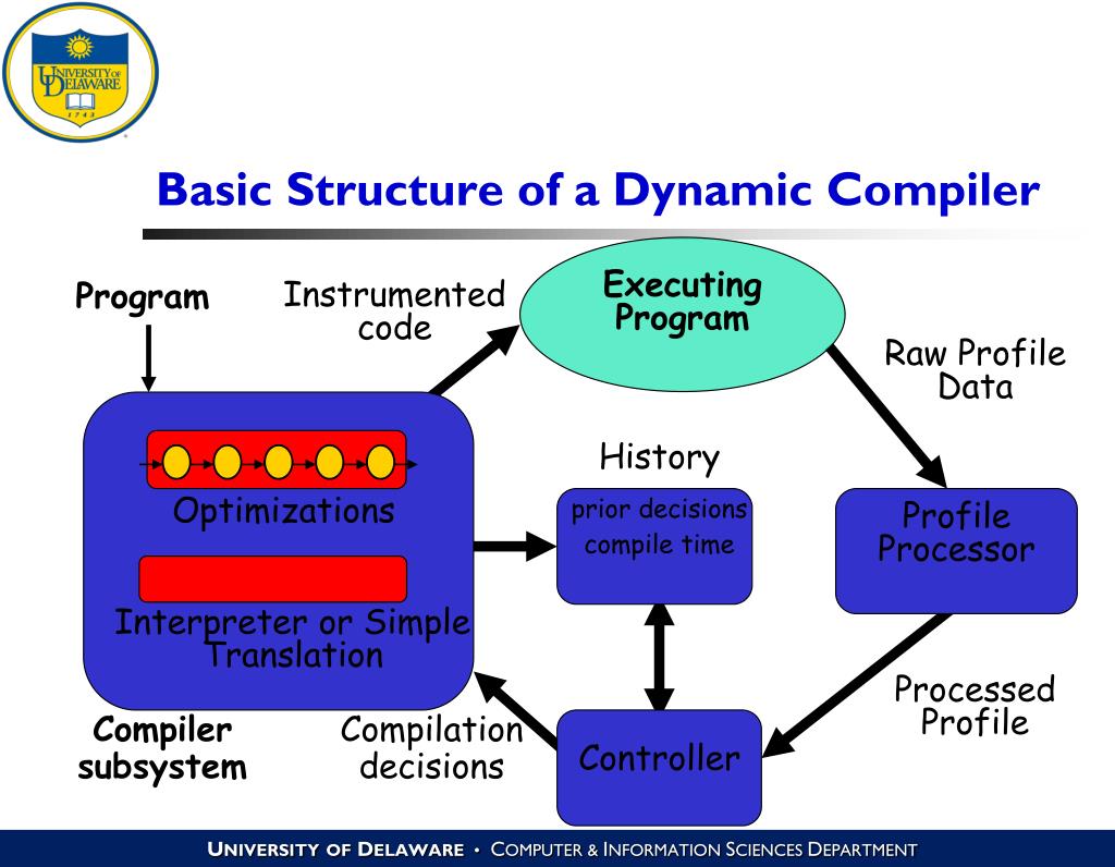 Executing Program Program Basic Structure of a Dynamic Compiler Instrumented code Raw Profile Data History prior decisions compile time Optimizations Profile Processor Interpreter or Simple Translation Processed Profile Compiler subsystem Compilation decisions Controller