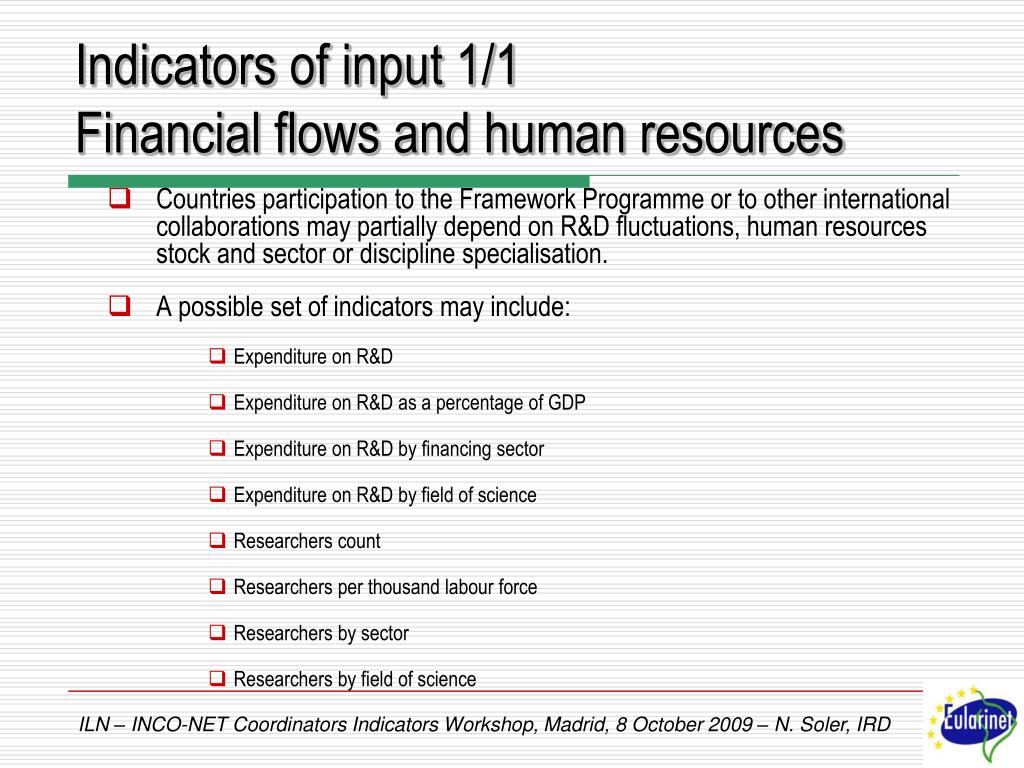 Indicators of input 1/1Financial flows and human resources Countries participation to the Framework Programme or to other international collaborations may partially depend on R&D fluctuations, human resources stock and sector or discipline specialisation. A possible set of indicators may include: Expenditure on R&D Expenditure on R&D as a percentage of GDP Expenditure on R&D by financing sector Expenditure on R&D by field of science Researchers count Researchers per thousand labour force Researchers by sector Researchers by field of science