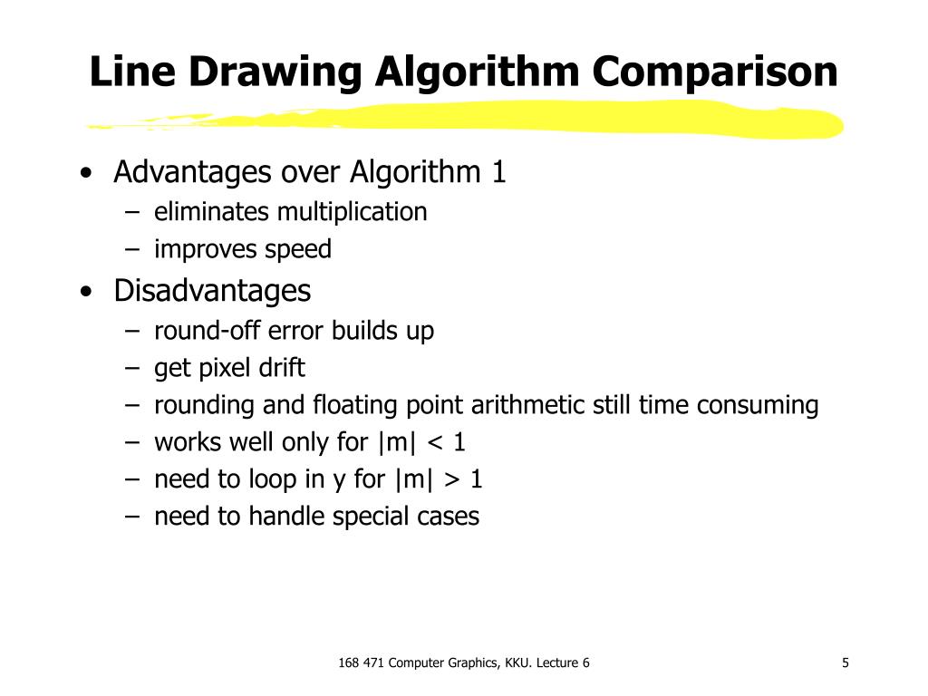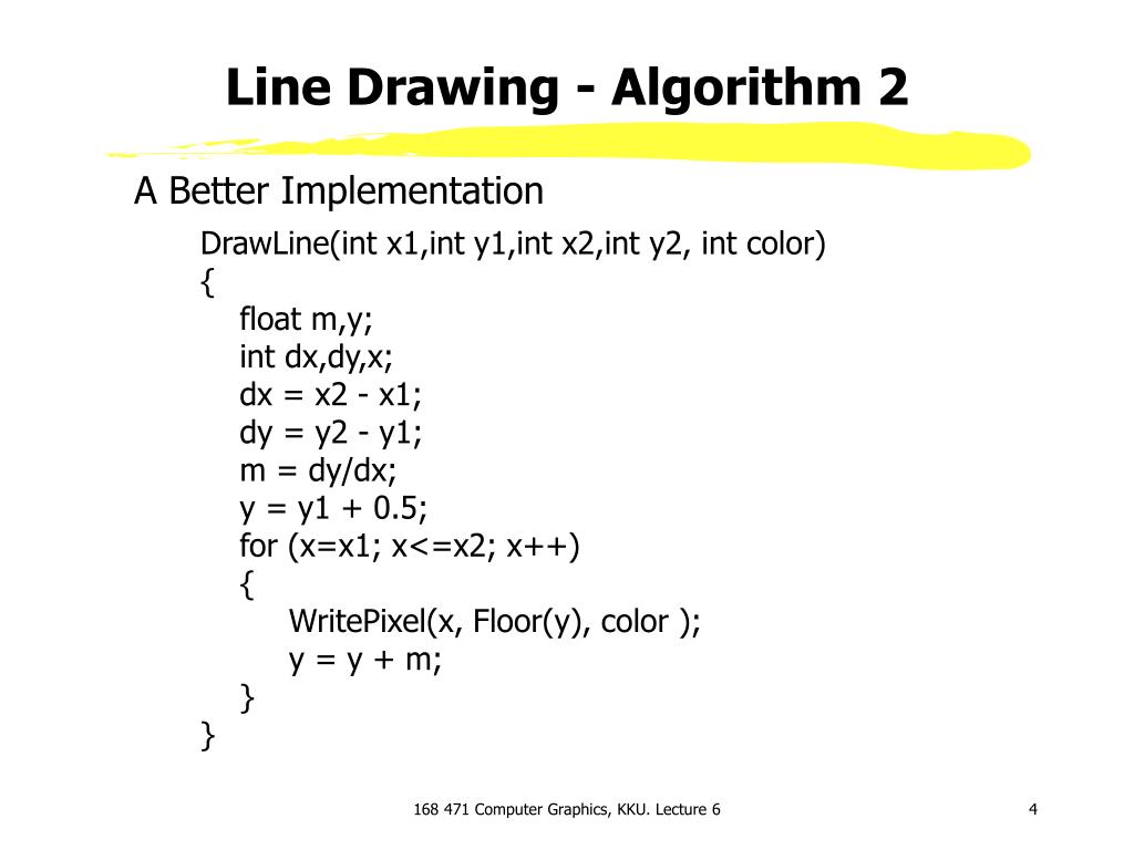 Line Drawing - Algorithm 1 A Straightforward Implementation DrawLine(int x1,int y1, int x2,int y2, int color) { float y; int x; for (x=x1; x<=x2; x++) { y = y1 + (x-x1)*(y2-y1)/(x2-x1) WritePixel(x, Round(y), color ); } } 168 471 Computer Graphics, KKU. Lecture 6
