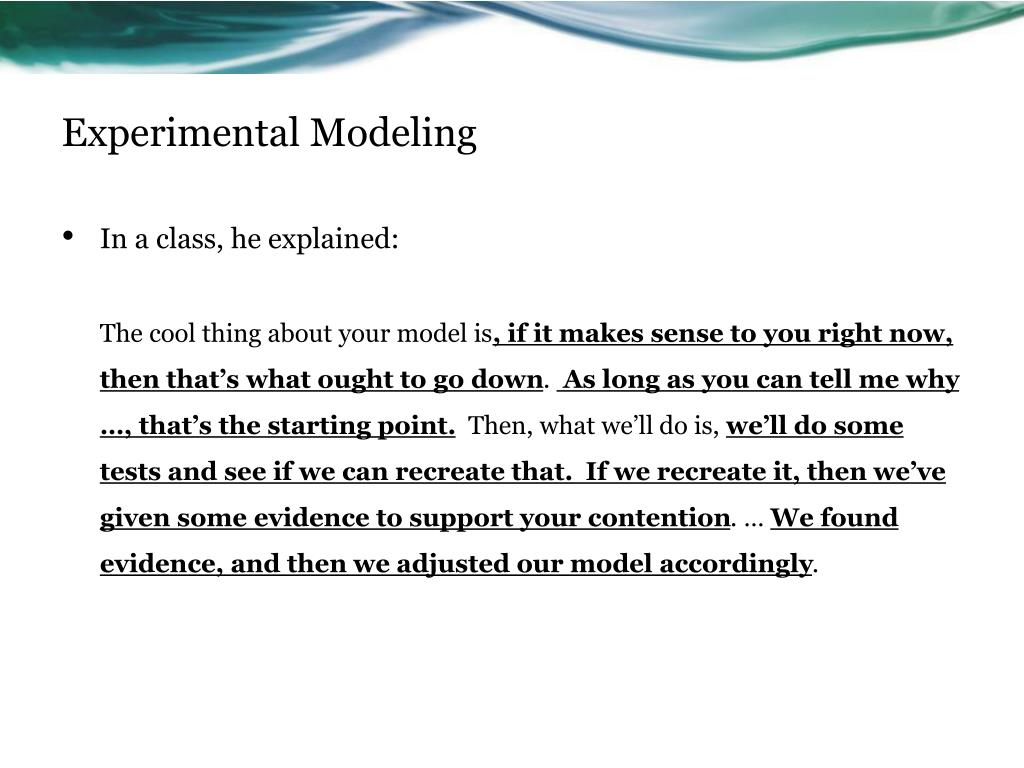 Experimental Modeling • In a class, he explained: The cool thing about your model is, if it makes sense to you right now, then that’s what ought to go down. As long as you can tell me why …, that’s the starting point. Then, what we’ll do is, we’ll do some tests and see if we can recreate that. If we recreate it, then we’ve given some evidence to support your contention. … We found evidence, and then we adjusted our model accordingly.