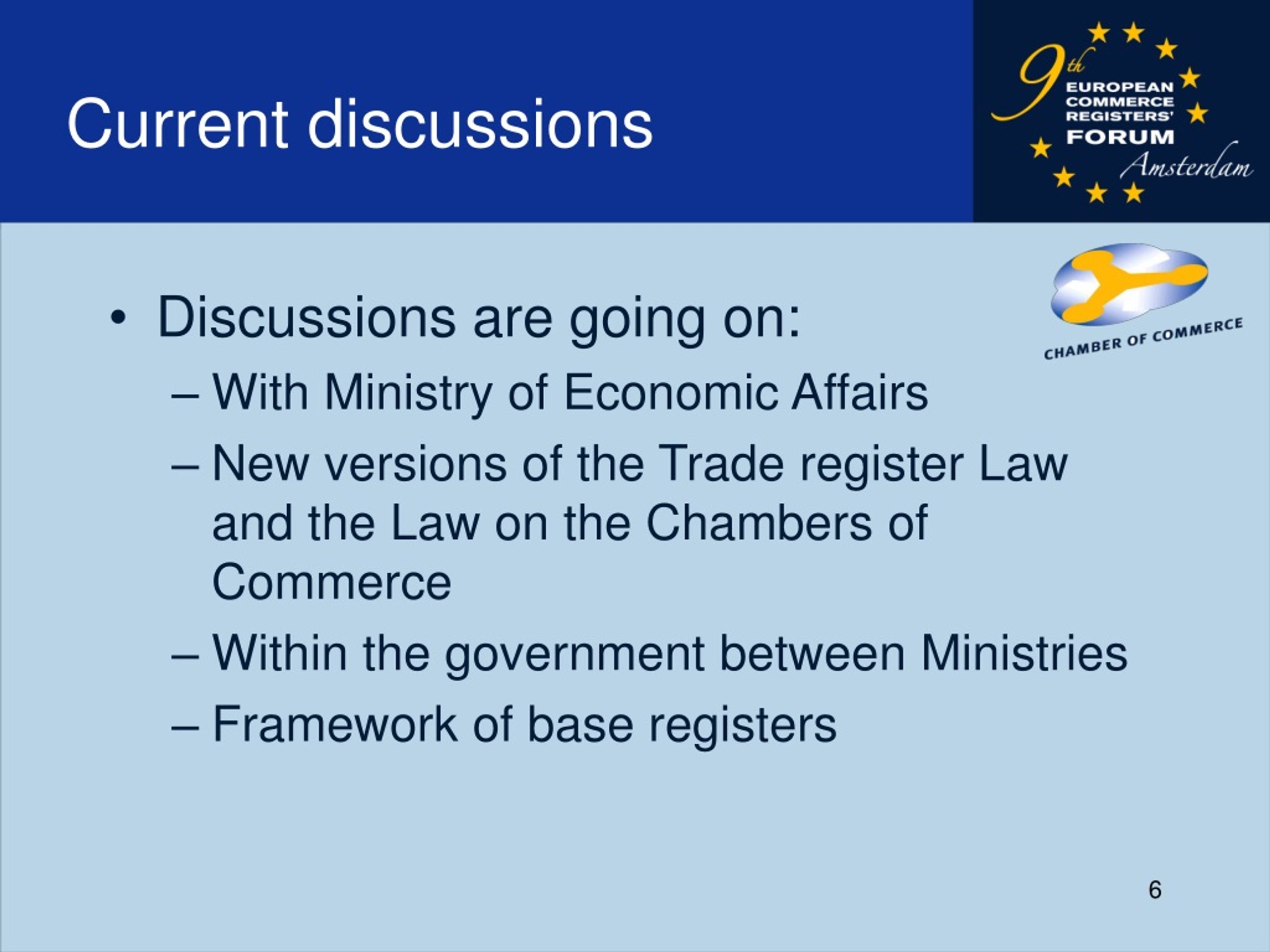 Current discussions • Discussions are going on: • With Ministry of Economic Affairs • New versions of the Trade register Law and the Law on the Chambers of Commerce • Within the government between Ministries • Framework of base registers