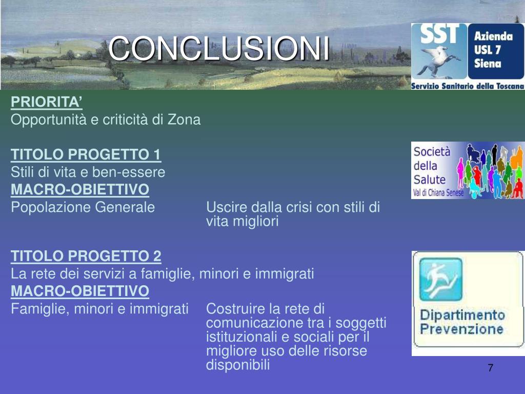 CONCLUSIONI PRIORITA’ Opportunità e criticità di Zona TITOLO PROGETTO 1 Stili di vita e ben-essere MACRO-OBIETTIVO Popolazione Generale Uscire dalla crisi con stili di vita migliori TITOLO PROGETTO 2 La rete dei servizi a famiglie, minori e immigrati MACRO-OBIETTIVO Famiglie, minori e immigrati Costruire la rete di comunicazione tra i soggetti istituzionali e sociali per il migliore uso delle risorse disponibili