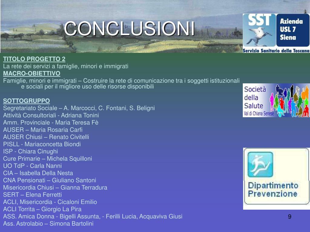 CONCLUSIONI TITOLO PROGETTO 2 La rete dei servizi a famiglie, minori e immigrati MACRO-OBIETTIVO Famiglie, minori e immigrati – Costruire la rete di comunicazione tra i soggetti istituzionali e sociali per il migliore uso delle risorse disponibili SOTTOGRUPPO Segretariato Sociale – A. Marcocci, C. Fontani, S. Beligni Attività Consultoriali - Adriana Tonini Amm. Provinciale - Maria Teresa Fè AUSER – Maria Rosaria Carfi AUSER Chiusi – Renato Civitelli PISLL - Mariaconcetta Biondi ISP - Chiara Cinughi Cure Primarie – Michela Squilloni UO TdP - Carla Nanni CIA – Isabella Della Nesta CNA Pensionati – Giuliano Santoni Misericordia Chiusi – Gianna Terradura SERT – Elena Ferretti ACLI, Misericordia - Cicaloni Emilio ACLI Torrita – Giorgio La Pira ASS. Amica Donna - Bigelli Assunta, - Ferilli Lucia, Acquaviva Giusi Ass. Astrolabio – Simona Bartolini