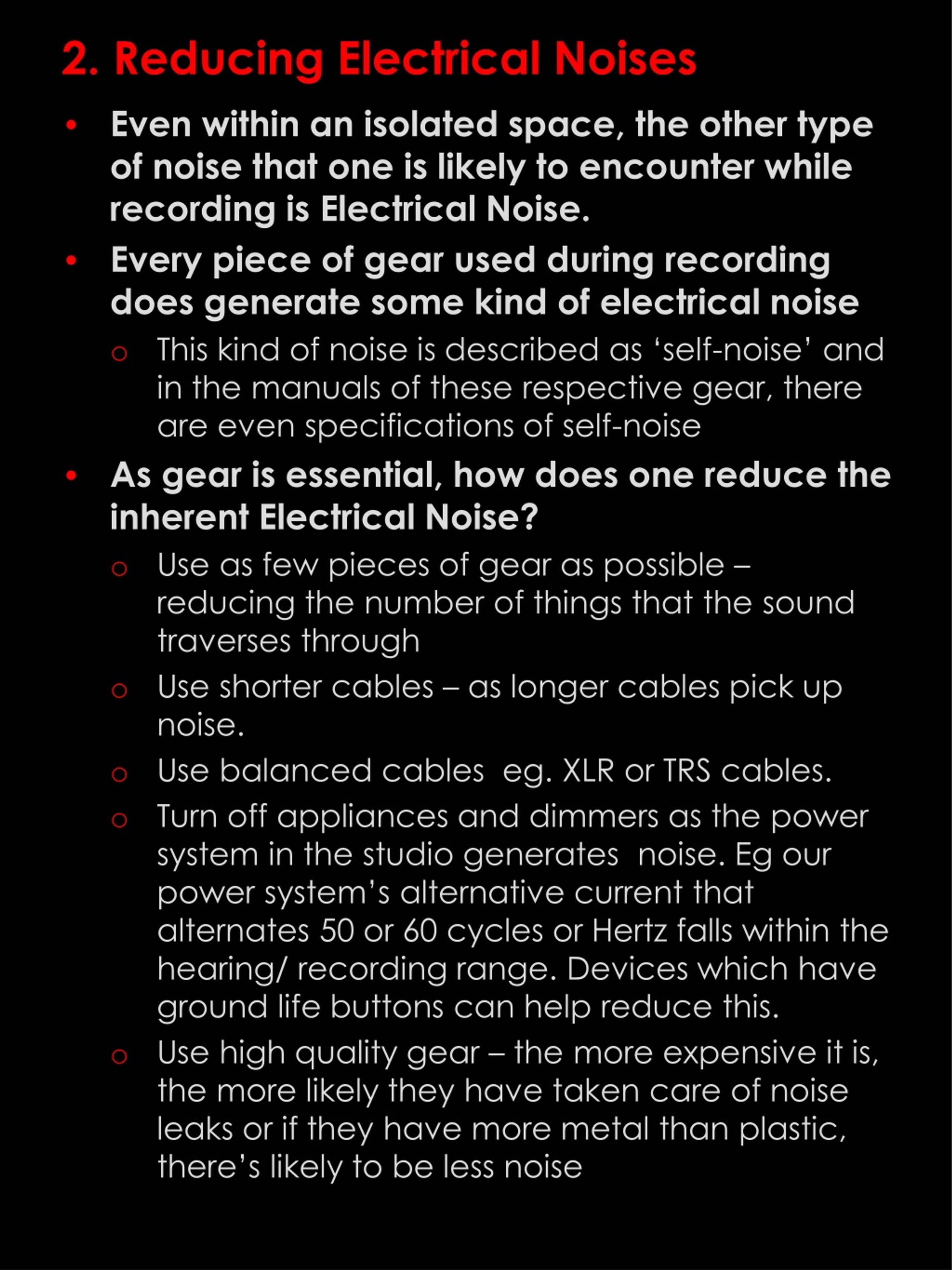 2. Reducing Electrical Noises • Even within an isolated space, the other type of noise that one is likely to encounter while recording is Electrical Noise. • Every piece of gear used during recording does generate some kind of electrical noise • This kind of noise is described as ‘self-noise’ and in the manuals of these respective gear, there are even specifications of self-noise • As gear is essential, how does one reduce the inherent Electrical Noise? • Use as few pieces of gear as possible – reducing the number of things that the sound traverses through • Use shorter cables – as longer cables pick up noise. • Use balanced cables eg. XLR or TRS cables. • Turn off appliances and dimmers as the power system in the studio generates noise. Eg our power system’s alternative current that alternates 50 or 60 cycles or Hertz falls within the hearing/ recording range. Devices which have ground life buttons can help reduce this. • Use high quality gear – the more expensive it is, the more likely they have taken care of noise leaks or if they have more metal than plastic, there’s likely to be less noise