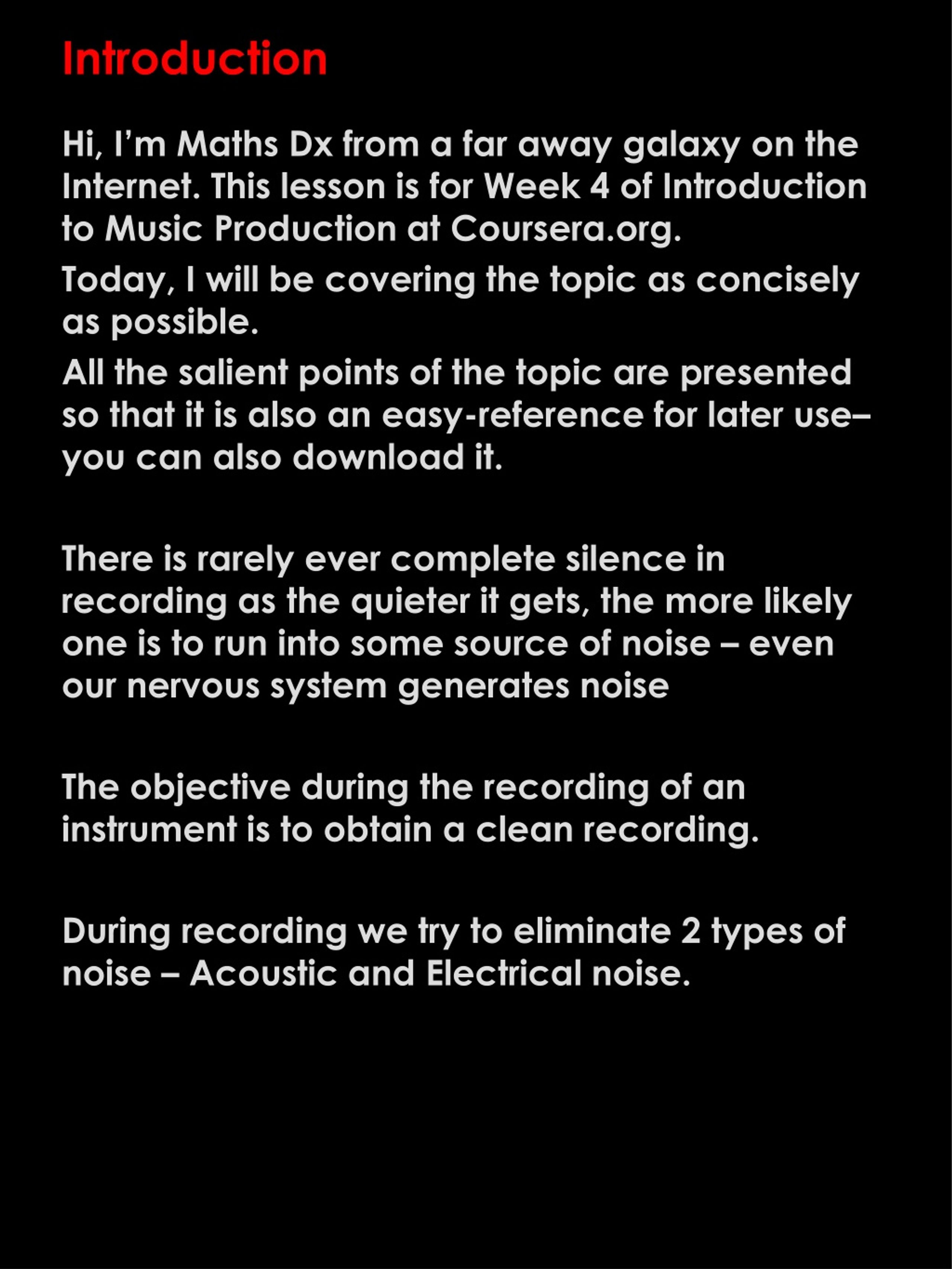 Introduction Hi, I’m Maths Dx from a far away galaxy on the Internet. This lesson is for Week 4 of Introduction to Music Production at Coursera.org. Today, I will be covering the topic as concisely as possible. All the salient points of the topic are presented so that it is also an easy-reference for later use– you can also download it. There is rarely ever complete silence in recording as the quieter it gets, the more likely one is to run into some source of noise – even our nervous system generates noise The objective during the recording of an instrument is to obtain a clean recording. During recording we try to eliminate 2 types of noise – Acoustic and Electrical noise.