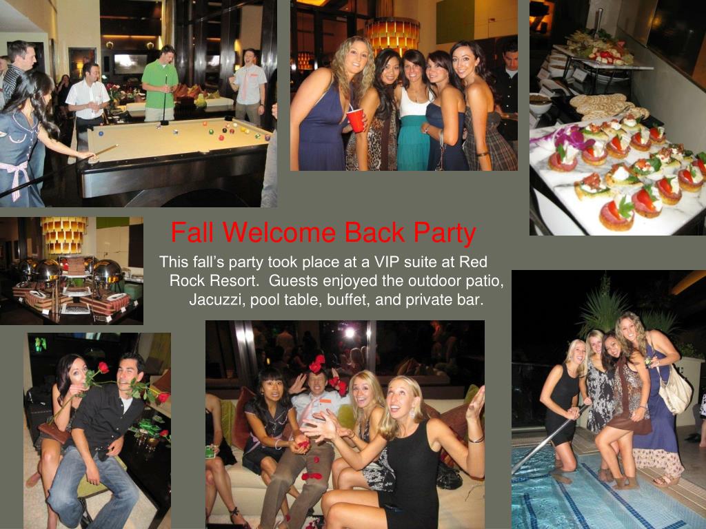 Fall Welcome Back Party This fall’s party took place at a VIP suite at Red Rock Resort. Guests enjoyed the outdoor patio, Jacuzzi, pool table, buffet, and private bar.