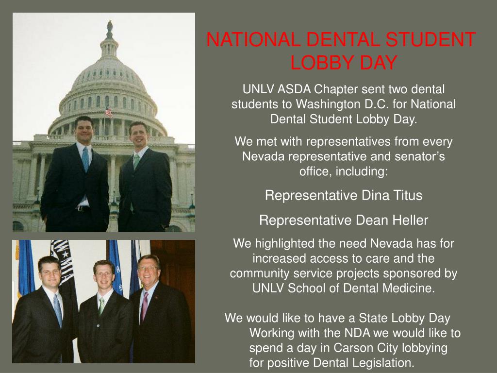NATIONAL DENTAL STUDENT LOBBY DAY • UNLV ASDA Chapter sent two dental students to Washington D.C. for National Dental Student Lobby Day. • We met with representatives from every Nevada representative and senator’s office, including: • Representative Dina Titus • Representative Dean Heller • We highlighted the need Nevada has for increased access to care and the community service projects sponsored by UNLV School of Dental Medicine. • We would like to have a State Lobby Day • Working with the NDA we would like to spend a day in Carson City lobbying for positive Dental Legislation.