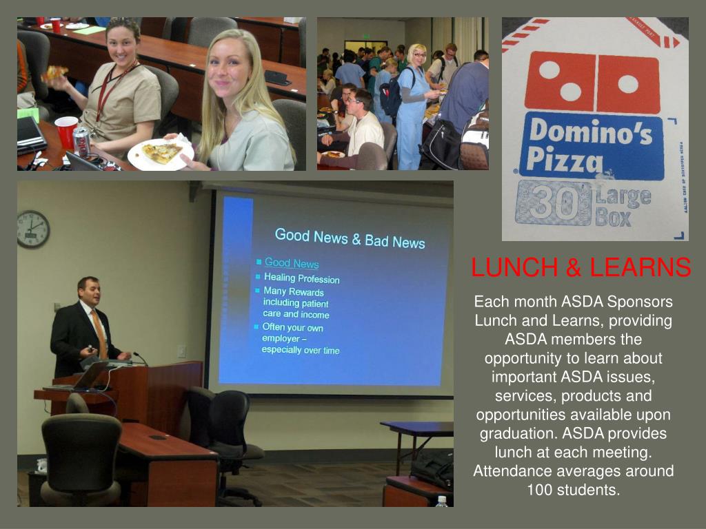 LUNCH & LEARNS Each month ASDA Sponsors Lunch and Learns, providing ASDA members the opportunity to learn about important ASDA issues, services, products and opportunities available upon graduation. ASDA provides lunch at each meeting. Attendance averages around 100 students.