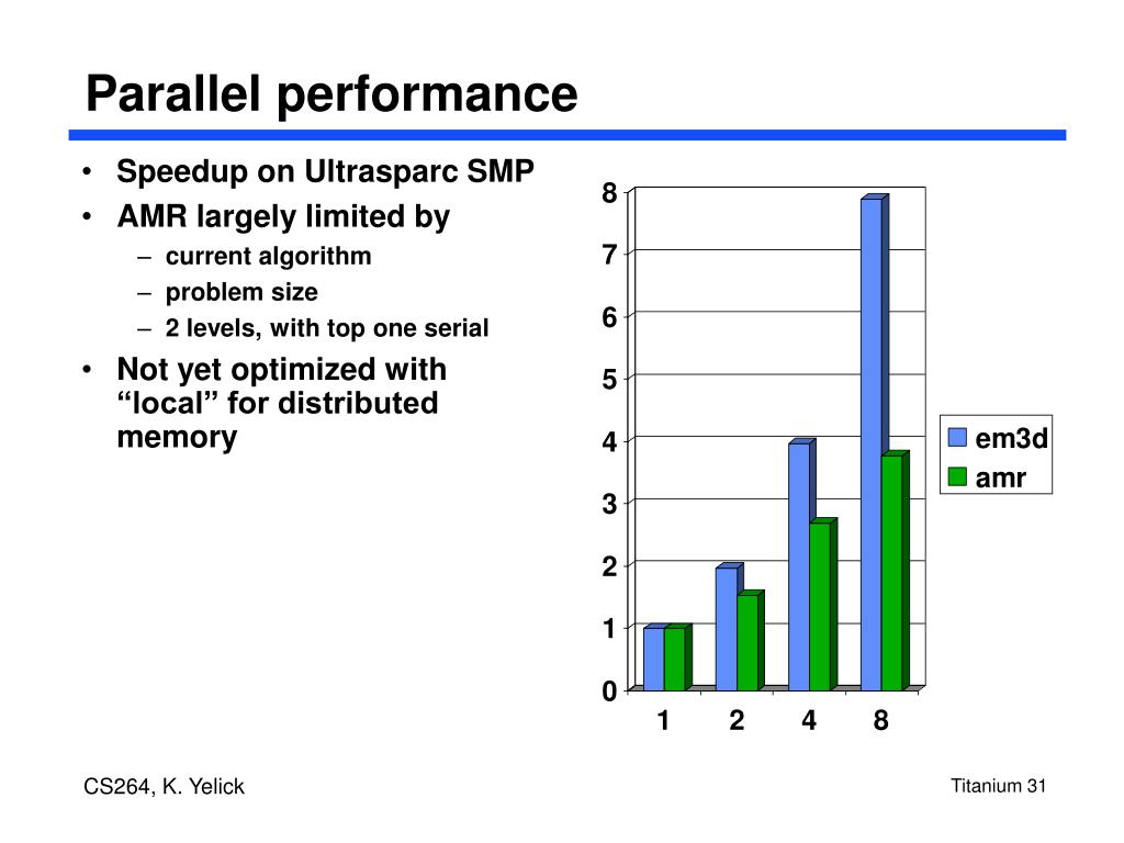 AMR Poisson • Poisson Solver [Semenzato, Pike, Colella] • 3D AMR • finite domain • variable coefficients • multigrid across levels • Performance of Titanium implementation • Sequential multigrid performance +/- 20% of Fortran • On fixed, well-balanced problem of 8 patches, 723 parallel speedups of 5.5 on 8 processors