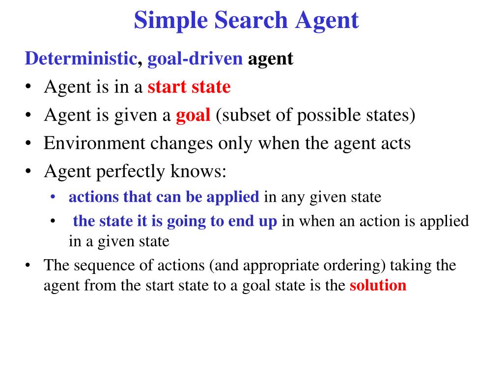 Simple Search Agent • Deterministic, goal-driven agent • Agent is in a start state • Agent is given a goal (subset of possible states) • Environment changes only when the agent acts • Agent perfectly knows: • actions that can be applied in any given state • the state it is going to end up in when an action is applied in a given state • The sequence of actions (and appropriate ordering) taking the agent from the start state to a goal state is the solution
