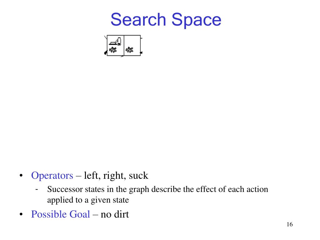Search Space • Operators – left, right, suck • Successor states in the graph describe the effect of each action applied to a given state • Possible Goal – no dirt